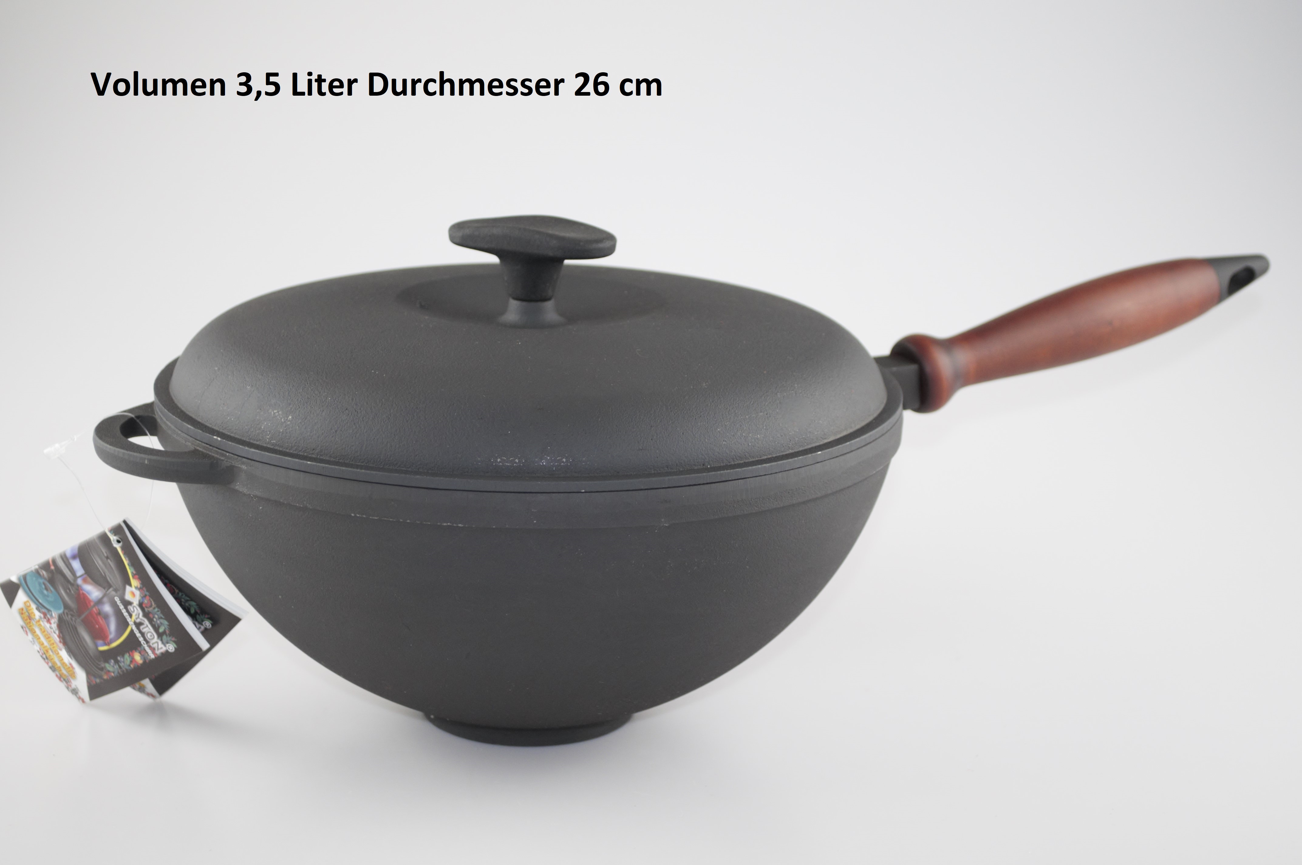 WOK aus Gusseisen 3,5 Liter mit Holzgriff und Deckel Wokpfanne ohne Beschichtung